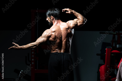 Rear View Of Bodybuilder Flexing His Back Muscles In A Classic